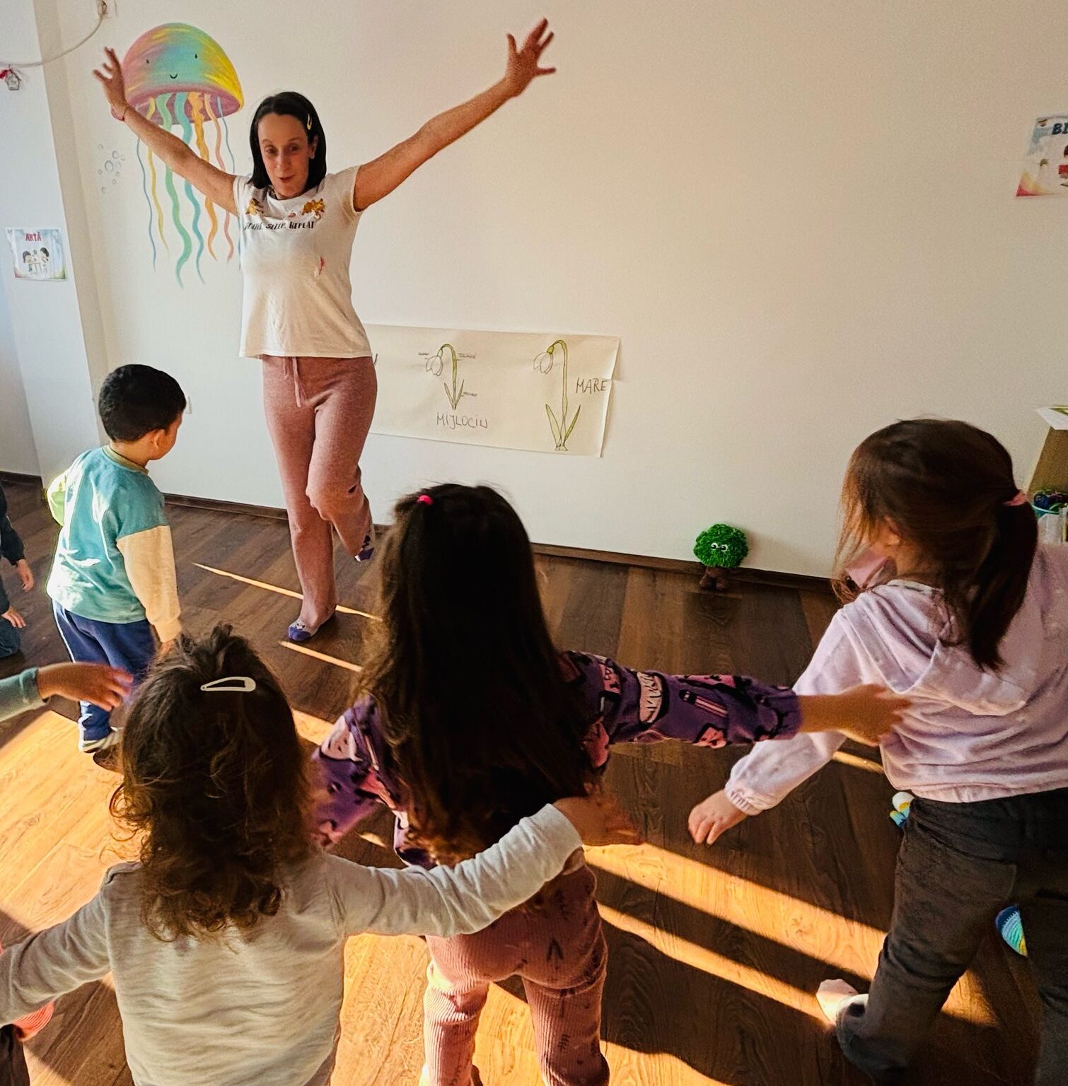 • Mișcare Creativă Conștientă: Copiii sunt încurajați să se distreze în timp ce își dezvoltă capacitățile motrice (flexibilitate, forta, coordonare).