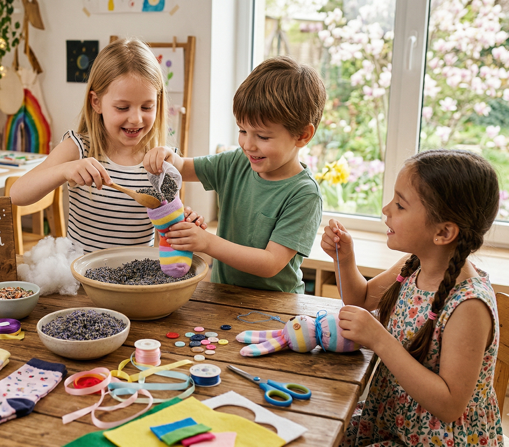 Părintele și copilul vor construi împreună un iepuraș anti-stres, plin cu orez și lavandă.